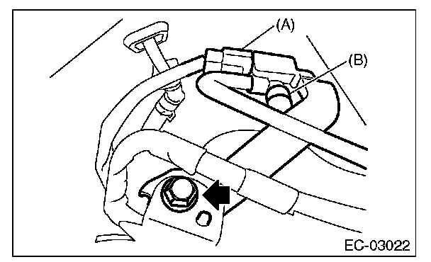 4. Disconnect the connector (A) and the pressure hose (B) from the fuel tank pressure sensor and remove the fuel tank pressure sensor together with the bracket.
