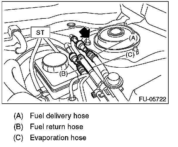2. Disconnect the quick connector of the fuel delivery hose and fuel return hose by pushing the ST in the direction of the arrow.