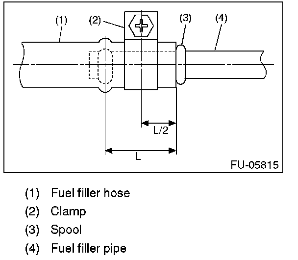 NOTE: Correctly insert the fuel filler hose to the spool, and then install the clamp as shown.