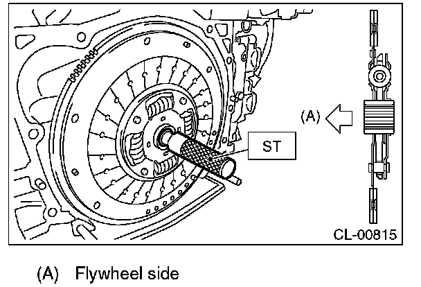 1) Insert the ST into the clutch disc and attach to the flywheel by inserting the ST end into pilot bearing.
