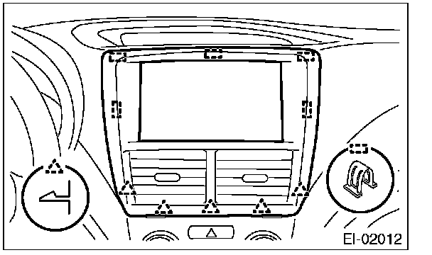8. Detach the screws and the plastic hooks to remove the ornament panel RH.