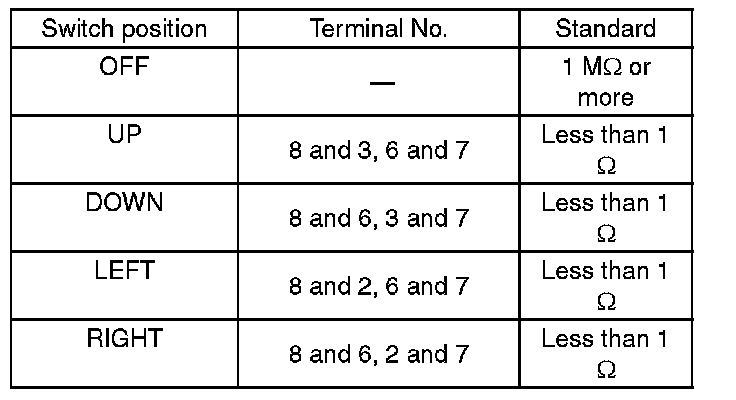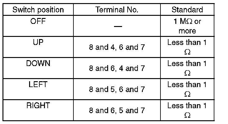 2. Check the resistance between remote control mirror switch terminals.