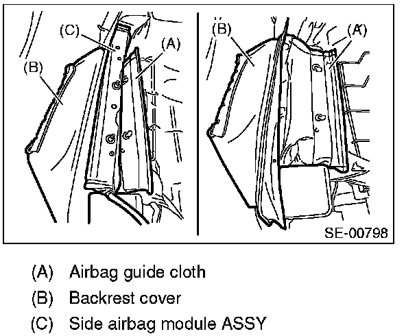 Besides, if the backrest cover is not installed securely, the side airbag module may not be activated properly, therefore keep strictly to the following procedures.