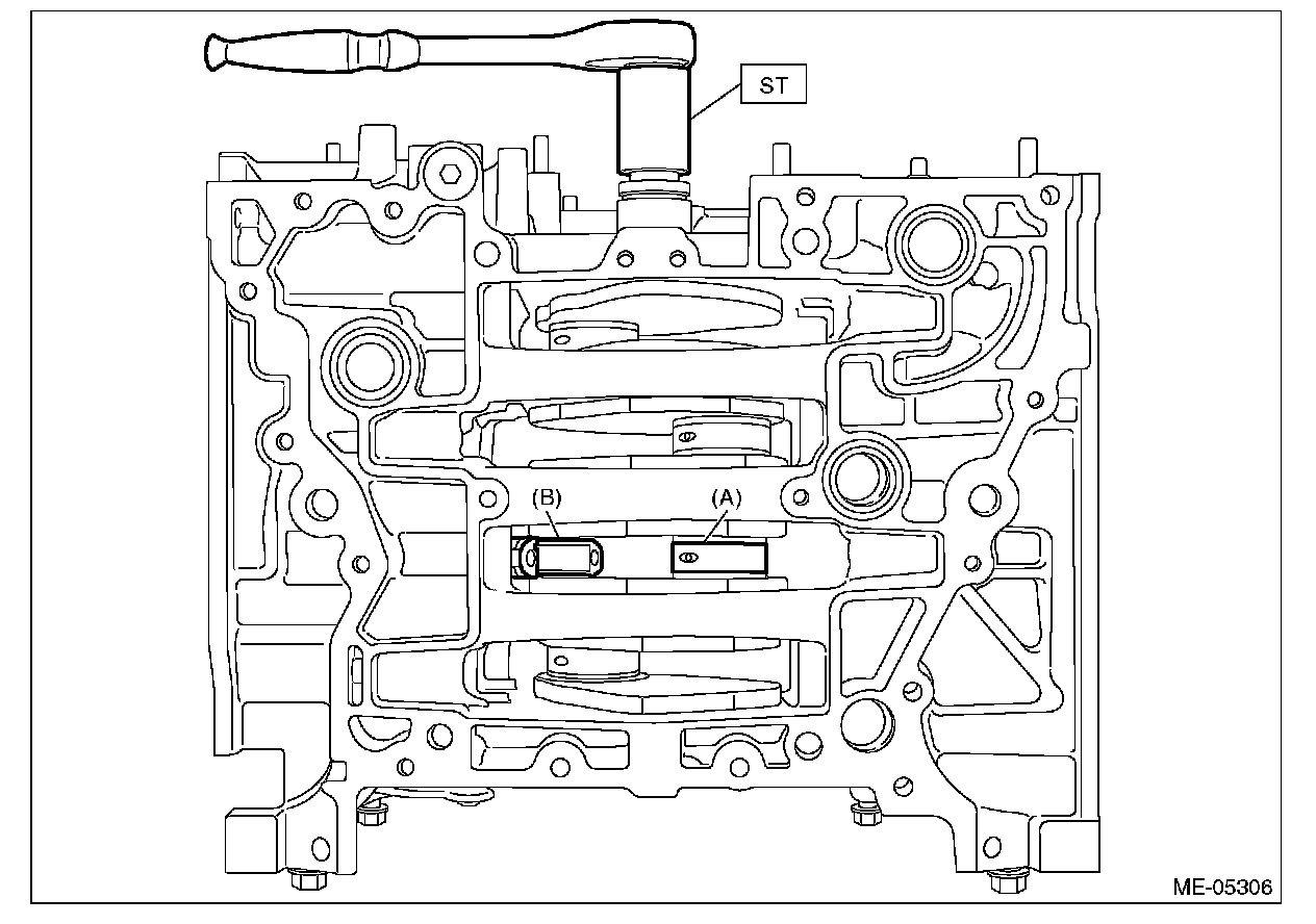 (1) Turn the crankshaft so that the #1 connecting rod cap (A) and #4 connecting rod cap (B) is located at the position shown in the figure using ST.