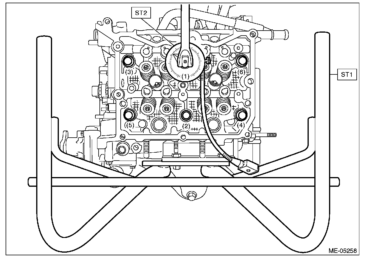 (6) Using ST2, tighten all cylinder head bolts with specified angle in numerical order as shown in the figure.