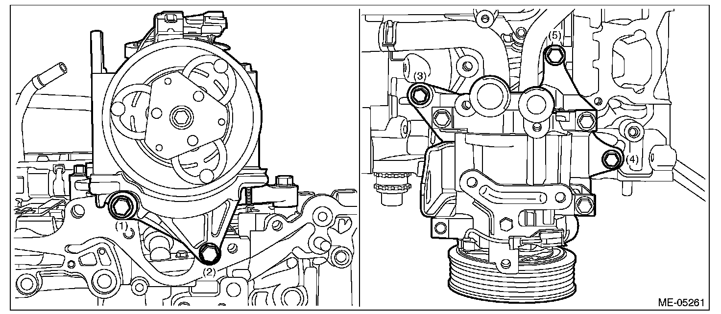 5) Set the A/C compressor bracket to the cylinder head LH, and tighten the bolts in numerical order as shown in the figure.