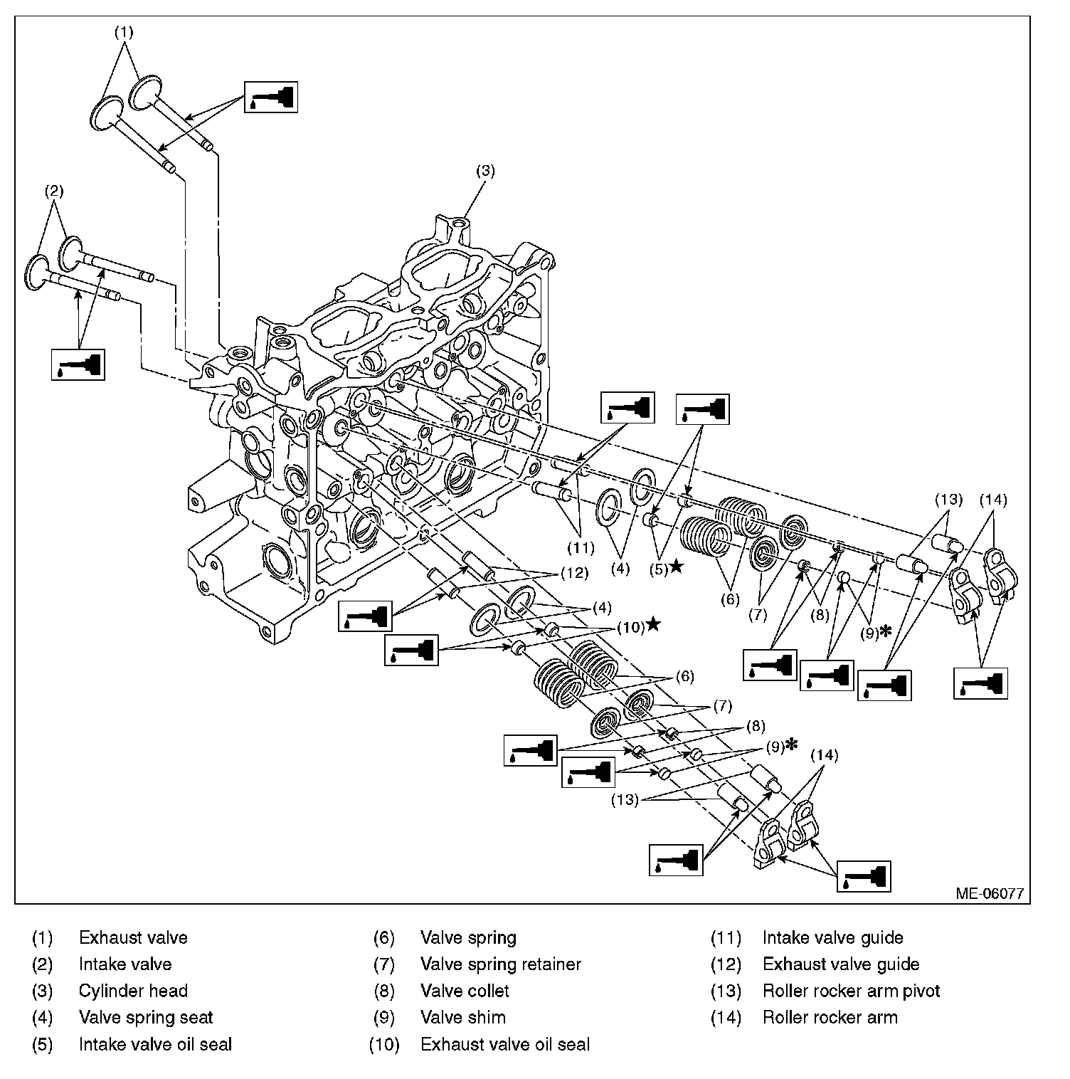(2) Coat the valve stem of each valve with engine oil and insert the valve into valve guide.