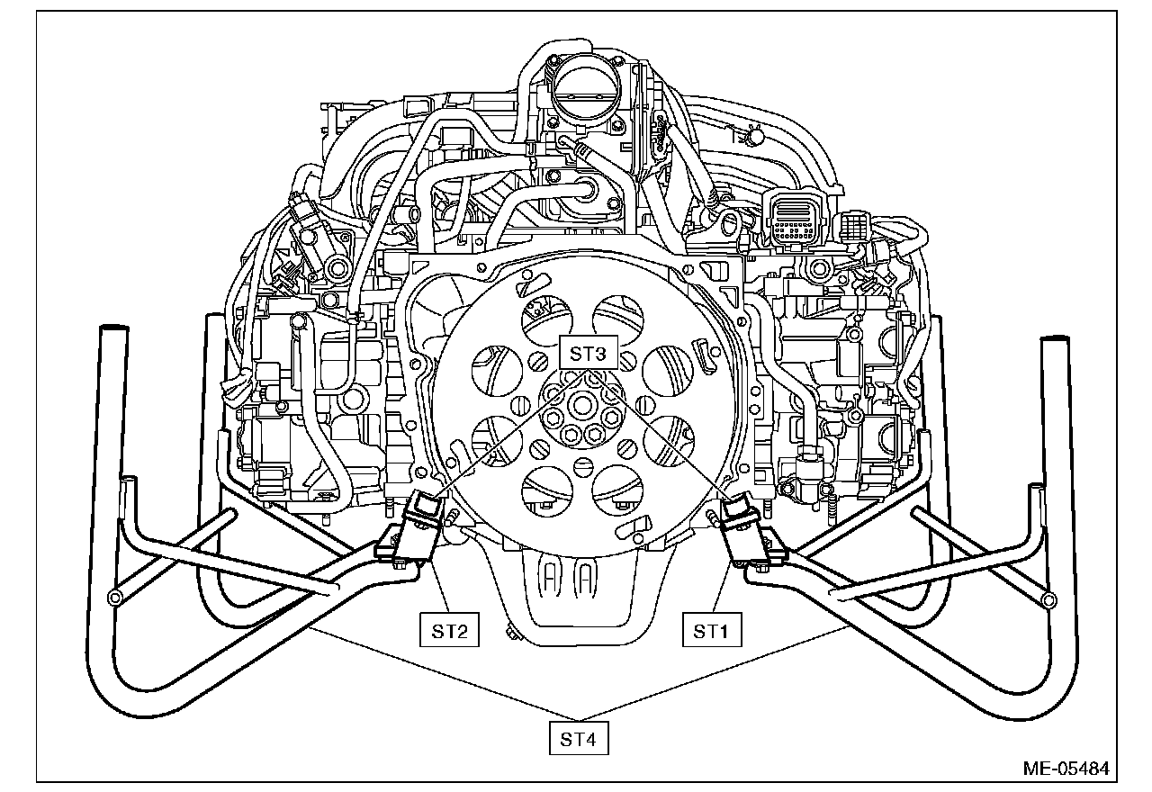 1) After removing the engine from vehicle body, attach the ST to the engine as shown in the figure.