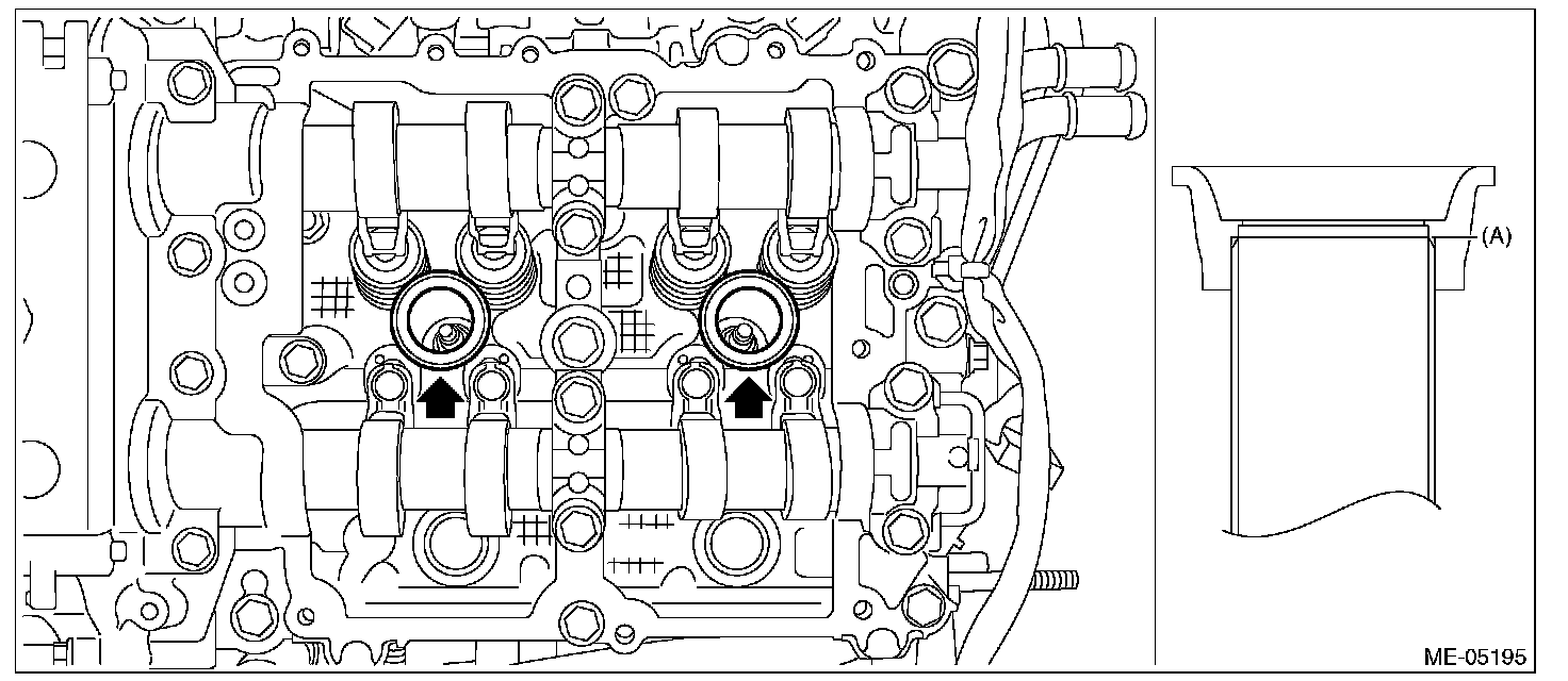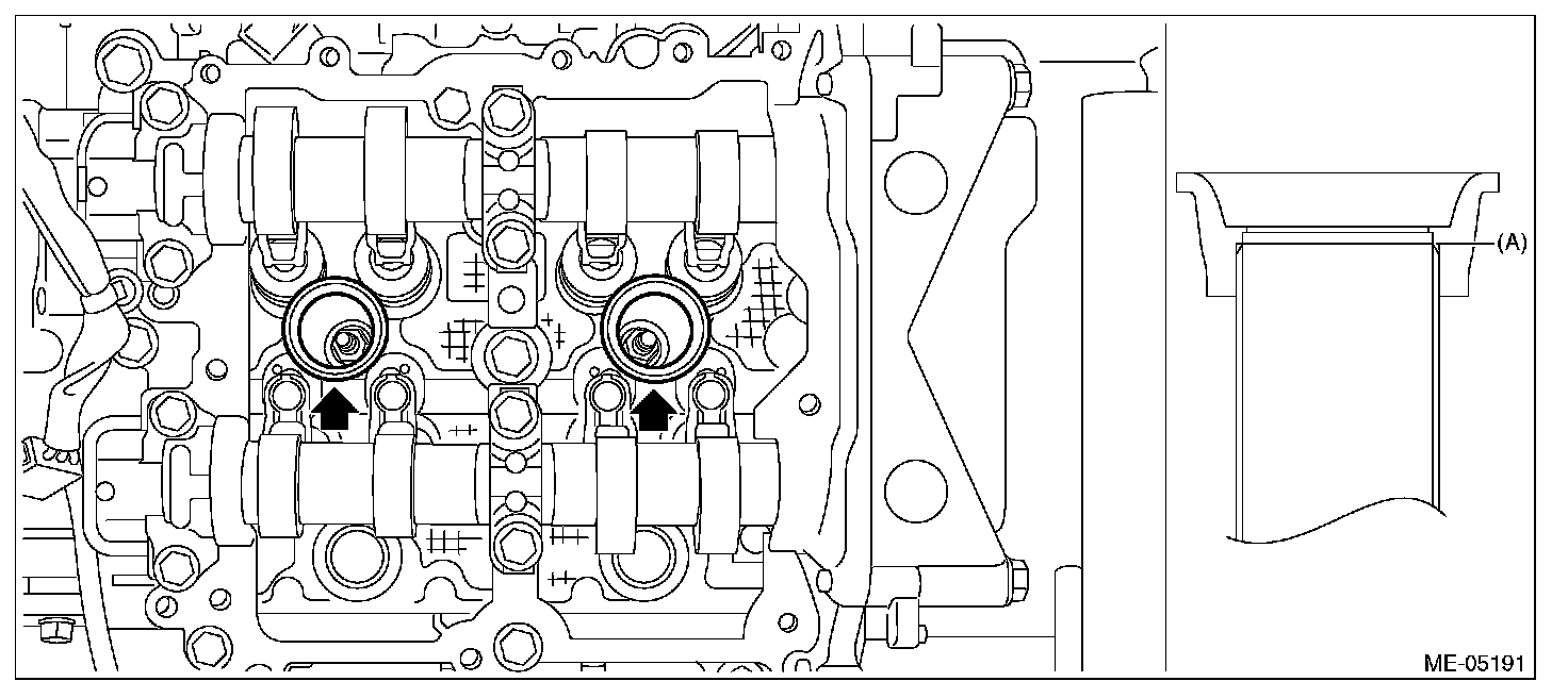 ^ Apply a light coat of engine oil to the #2 spark plug pipe gasket and #4 spark plug pipe gasket, and insert them onto the spark plug pipe edge (A).