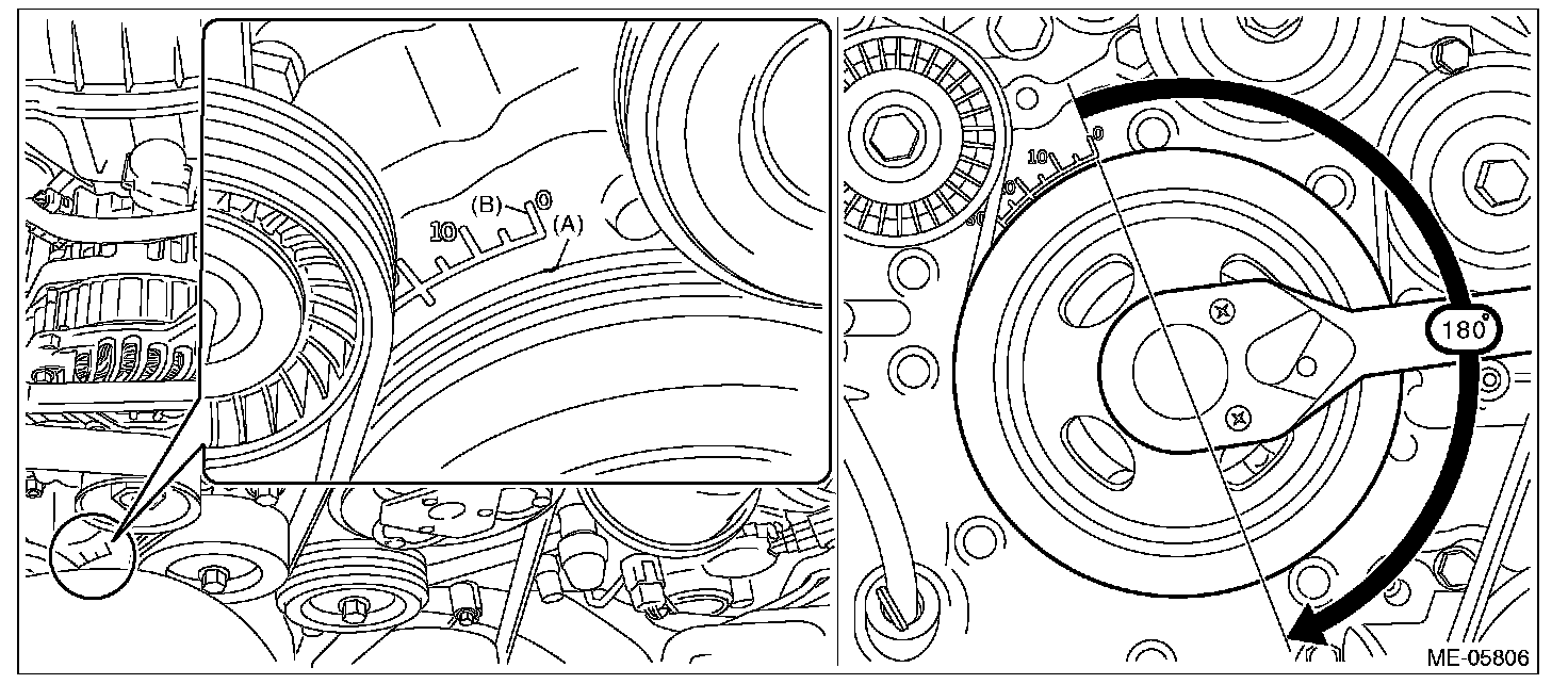 (4) Align the timing mark (A) of crank pulley to the timing gauge (B) 0° of chain cover as shown in the figure, and turn the crankshaft by 180° clockwise from that position.