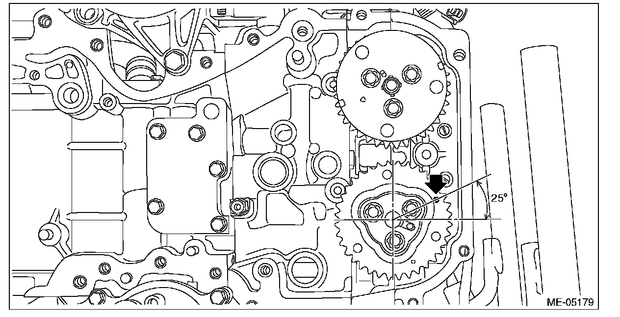 2) Check that the crank sprocket is located at the position sown in the figure. If not aligned, using ST turn the crankshaft to align the crank sprocket alignment mark to the position shown in the figure.