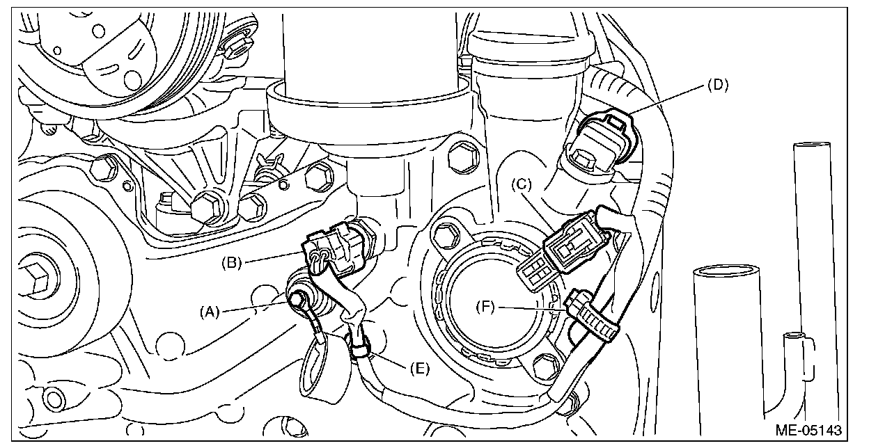 8) Disconnect the terminal (A) from the oil pressure switch, and connector (B) from the engine oil temperature sensor, and connector (C) from the oil control solenoid LH, and connector (D) from the camshaft position sensor LH, and remove the clip (E) and clip (F) which secure the engine harness.