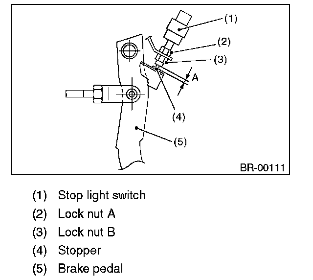 Loosen the lock nut, and adjust the stop light switch position until the clearance (A) between the threaded end of the stop light switch and stopper becomes 0.3 mm (0.012 in). Then, tighten the lock nut.