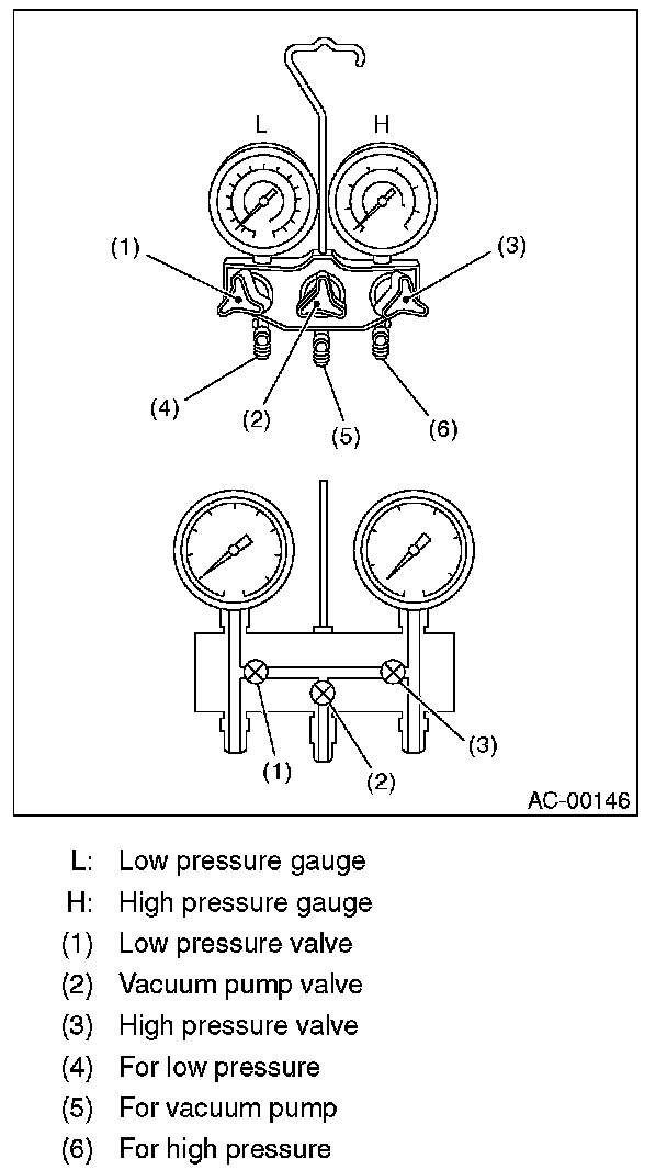 4. Operate the vacuum pump and open the low pressure and high pressure side valves. Next, open the center manifold hose valve, and begin evacuation.