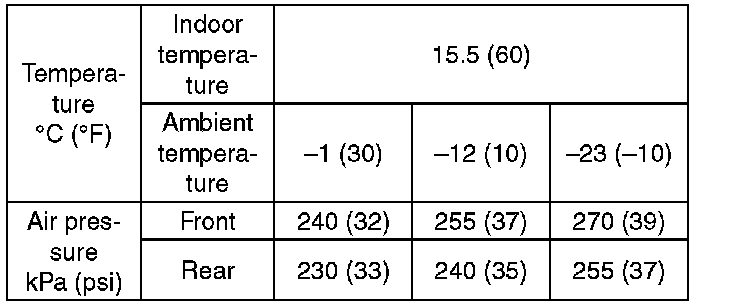 - When adjusting tire pressure indoors in winter, there is a big temperature difference between the indoor facilities and outside. Once the car is outside where the temperature is lower, the air pressure in the tires will drop, causing the tire pressure warning light to illuminate, even if the pressure in the tires was adjusted to standard values indoors. To avoid this, it is necessary to adjust the tire pressure to the high side in consideration of the difference in temperature between inside and outside according to the following table.