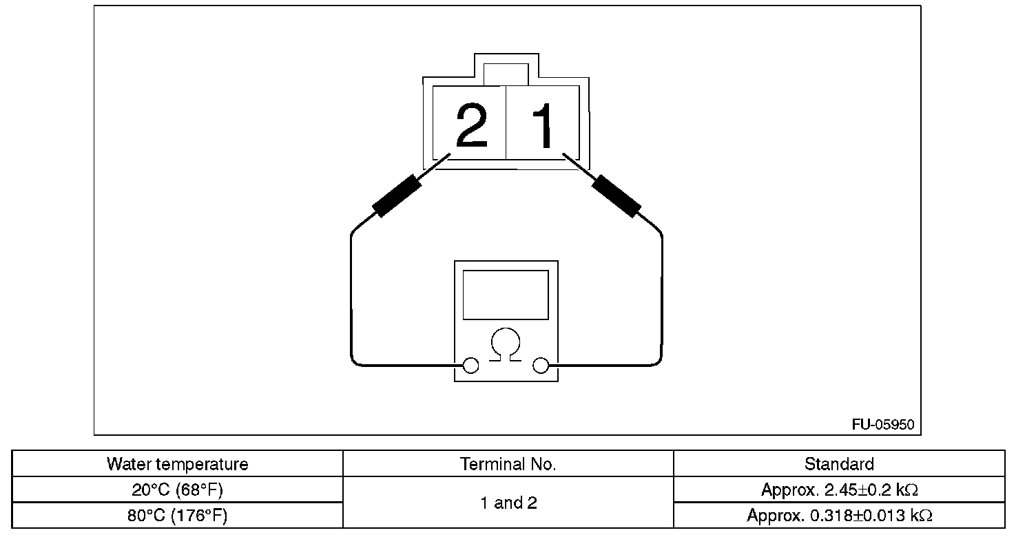 3. Raise water temperature gradually, measure the resistance between the engine coolant temperature sensor terminals when the temperature is 20 °C (68 °F) and 80 °C (176 °F).