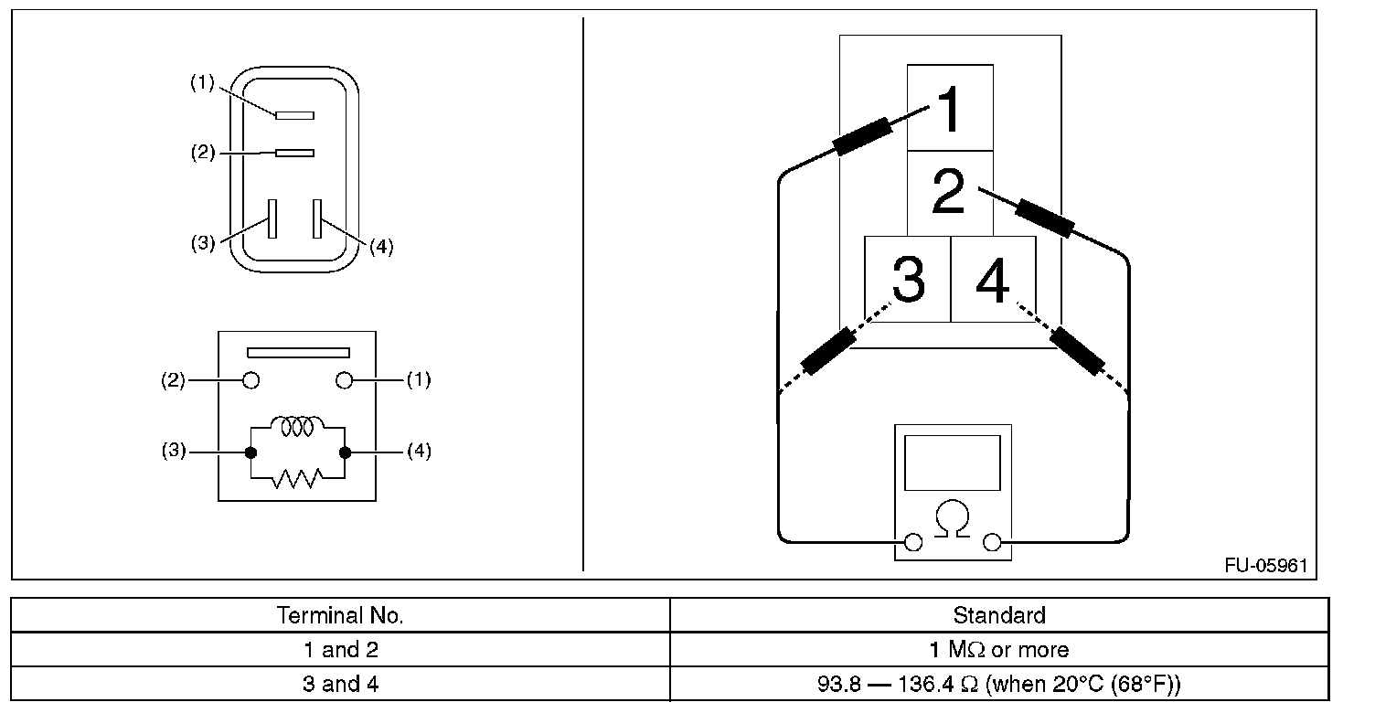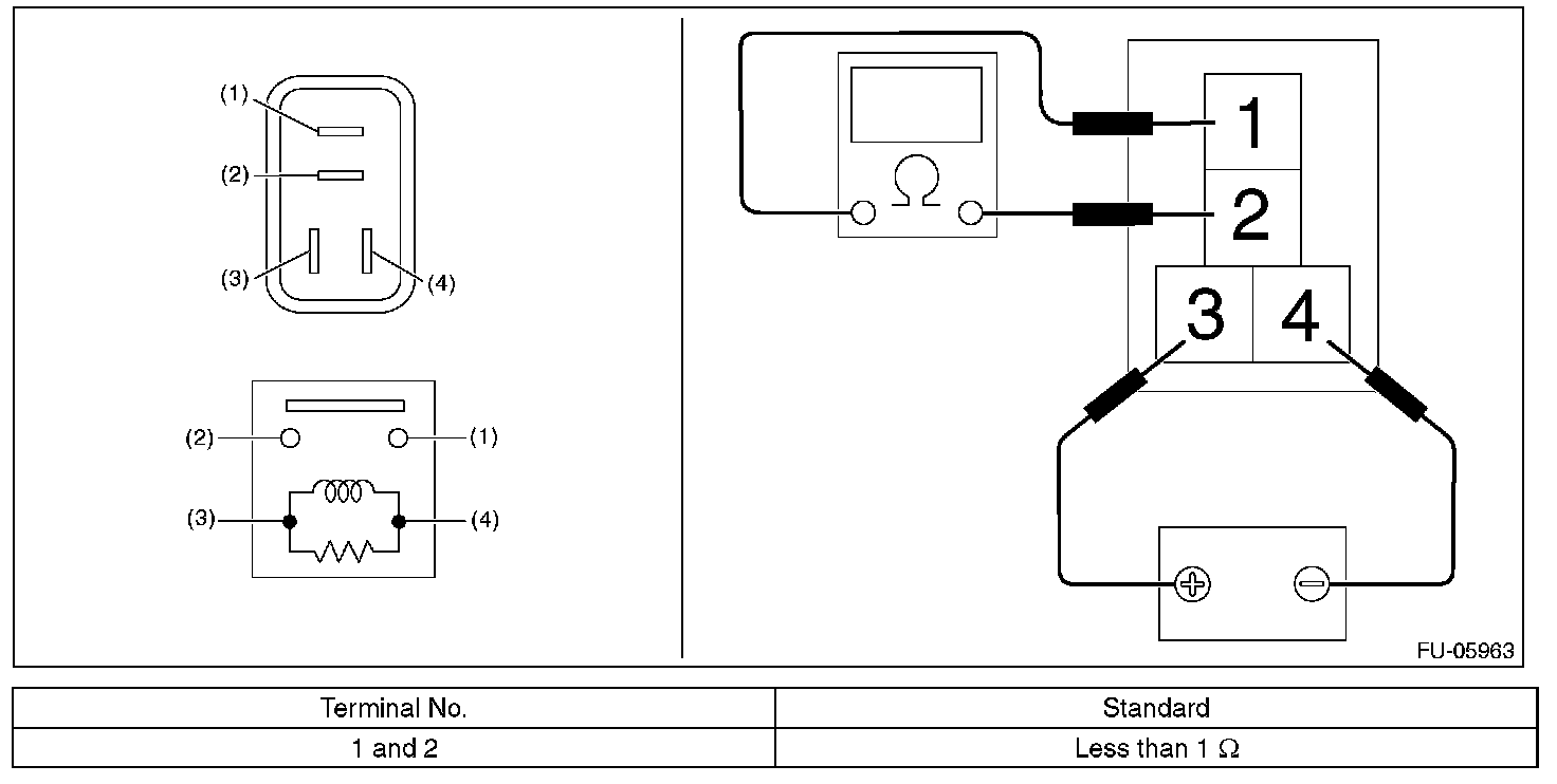 3. Connect battery positive terminal to terminal No. 3 and battery ground terminal to terminal No. 4, and measure the resistance between the electronic throttle control relay terminals.
