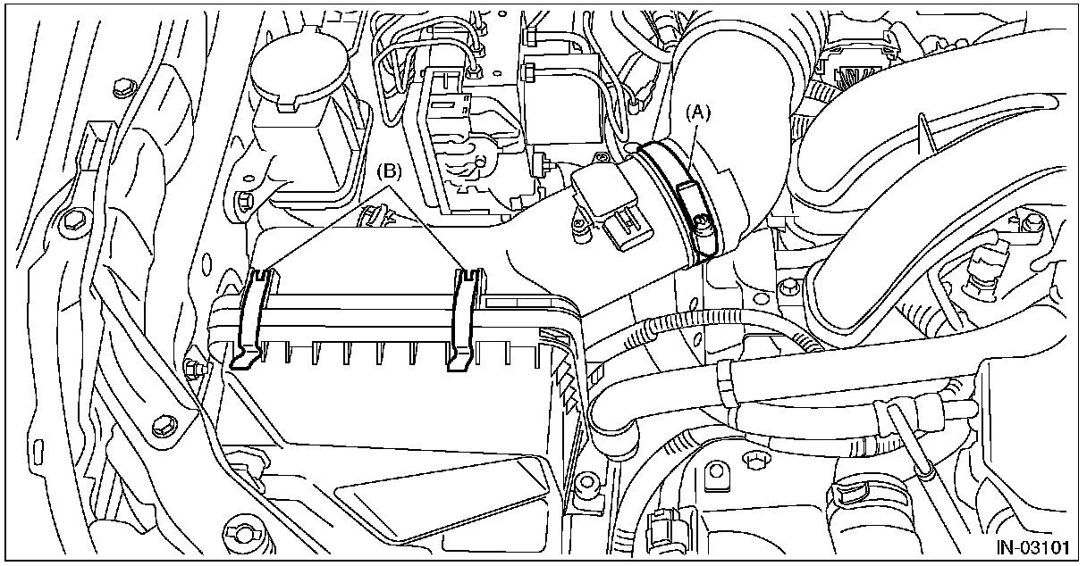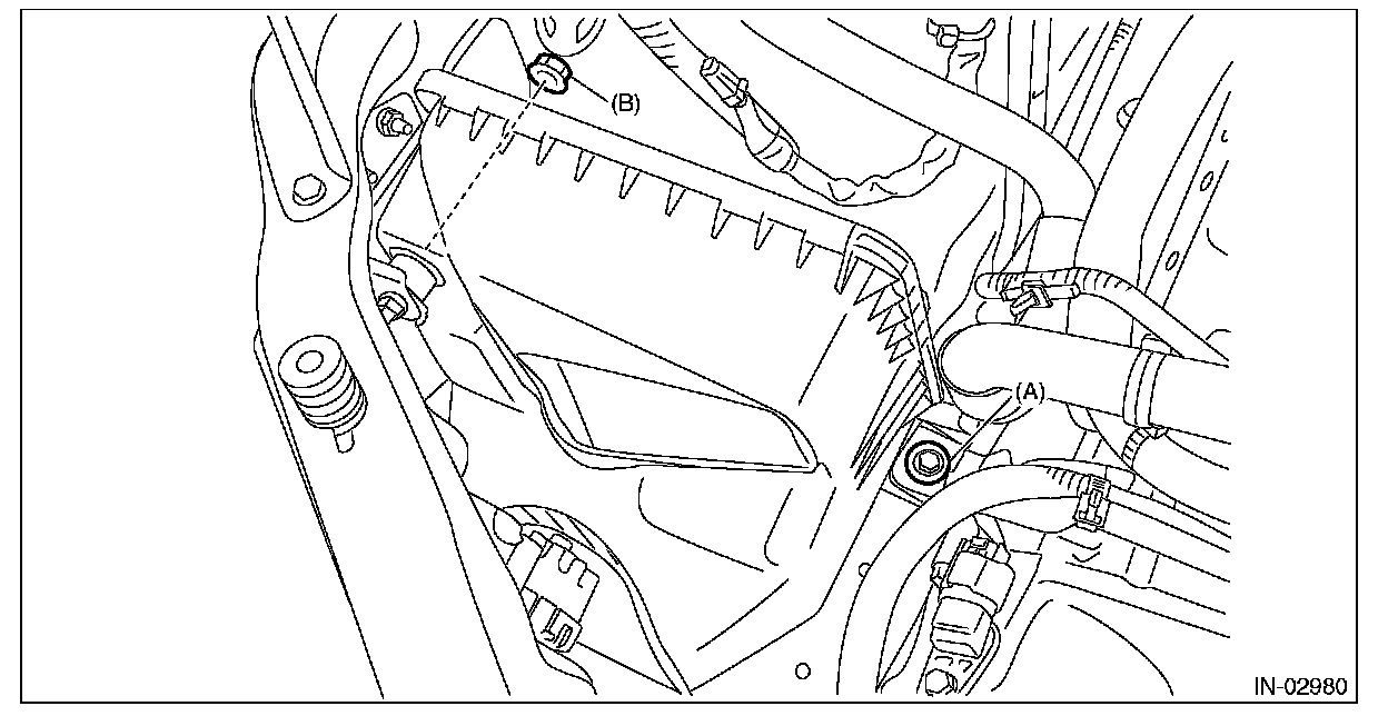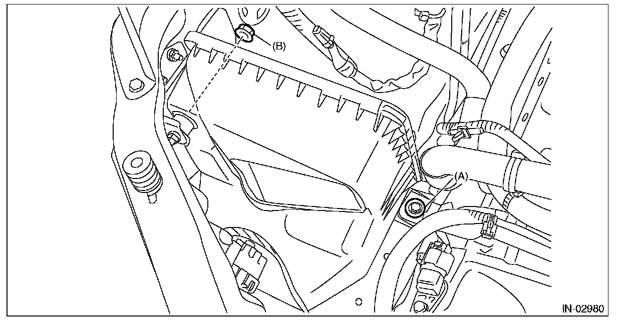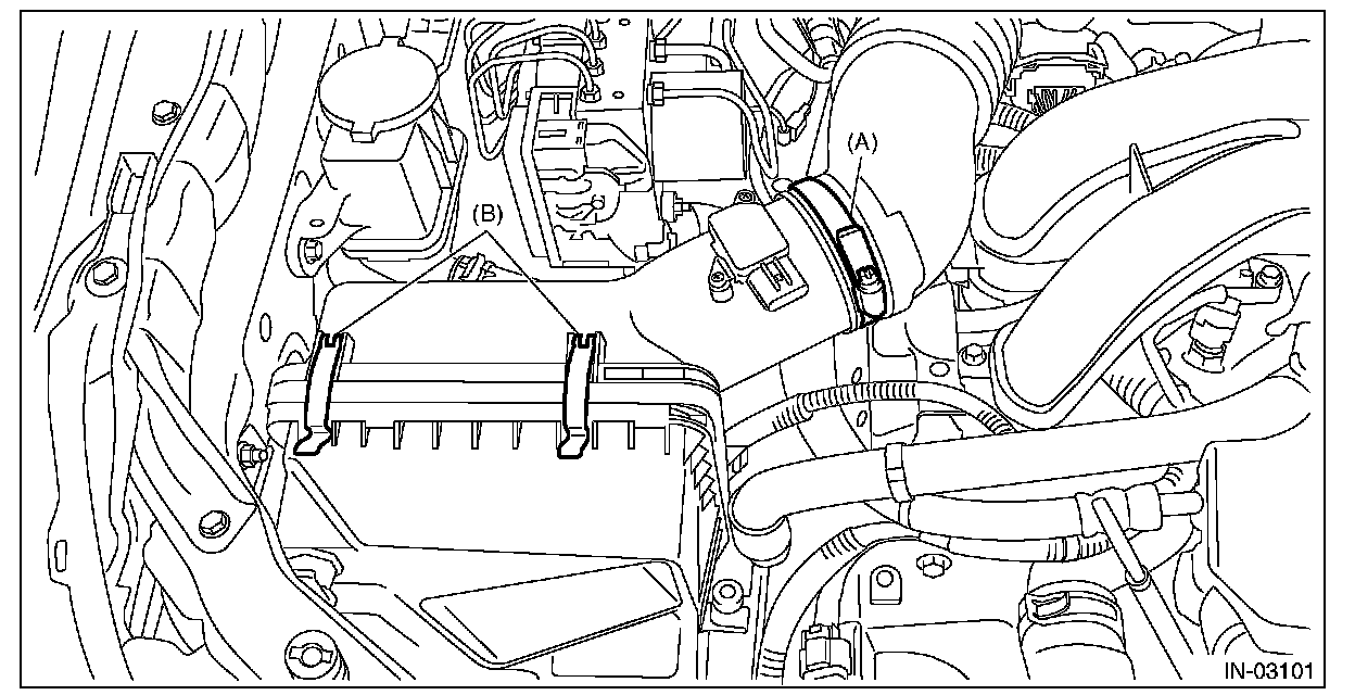 5. Loosen the clamp (A) which connects the air cleaner case (rear) and air intake boot, and then remove the clip (B) from the air cleaner case (front).