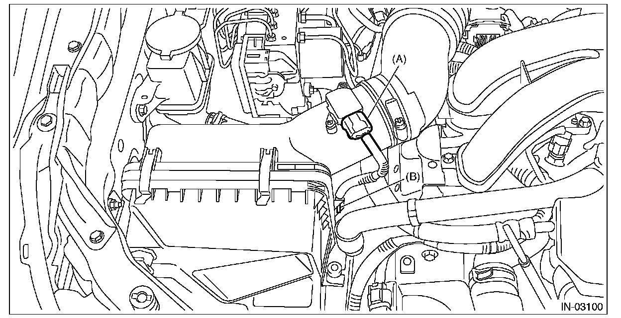 4. Connect the connector (A) to the mass air flow and intake air temperature sensor and secure the harness with clip (B).