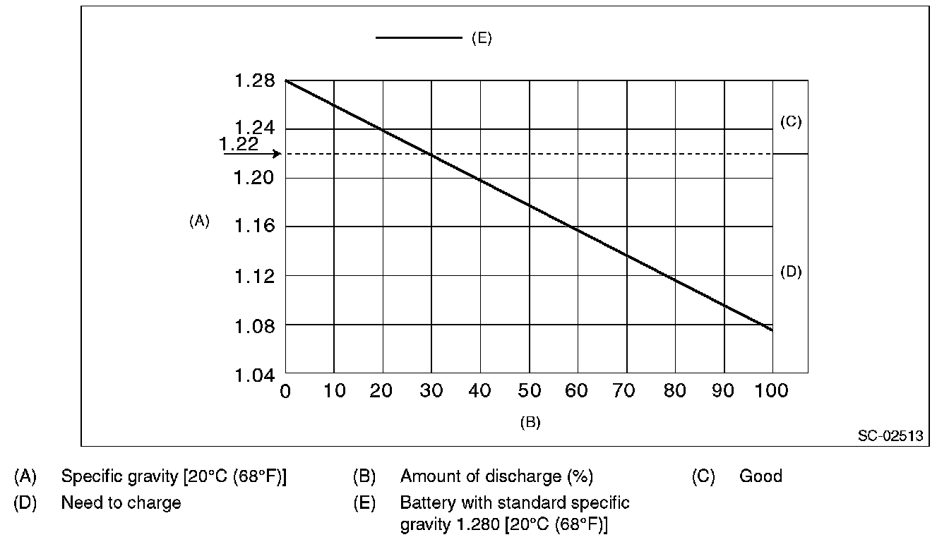 2. Measuring the specific gravity of the electrolyte in the battery will disclose the state of charge of the battery. The relation between specific gravity and state of charge is as shown in the figure.