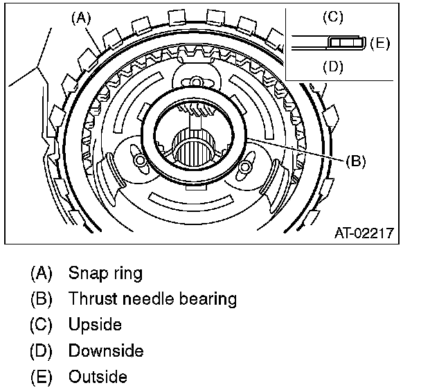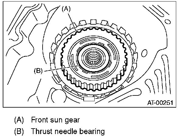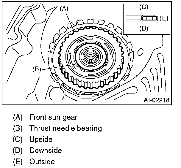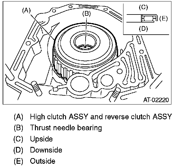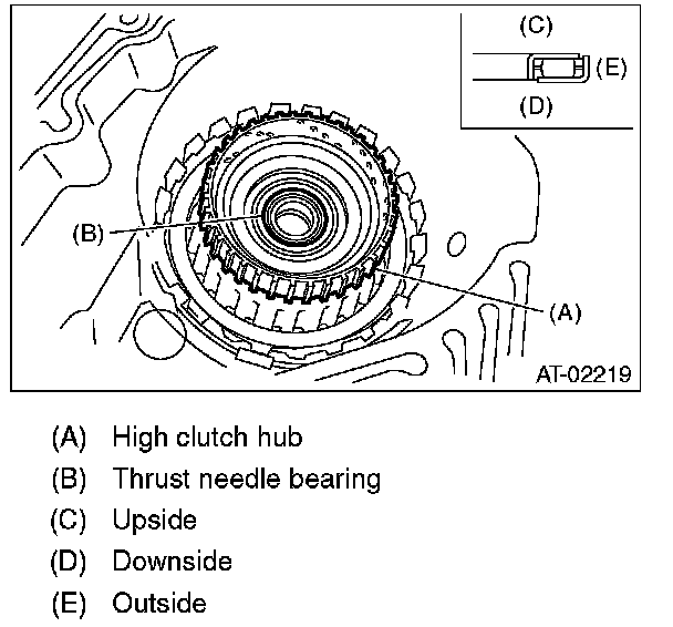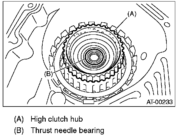 31) Apply Vaseline, and attach the thrust needle bearing to the high clutch hub, then engage the splines of the front planetary carrier correctly to install the high clutch hub.