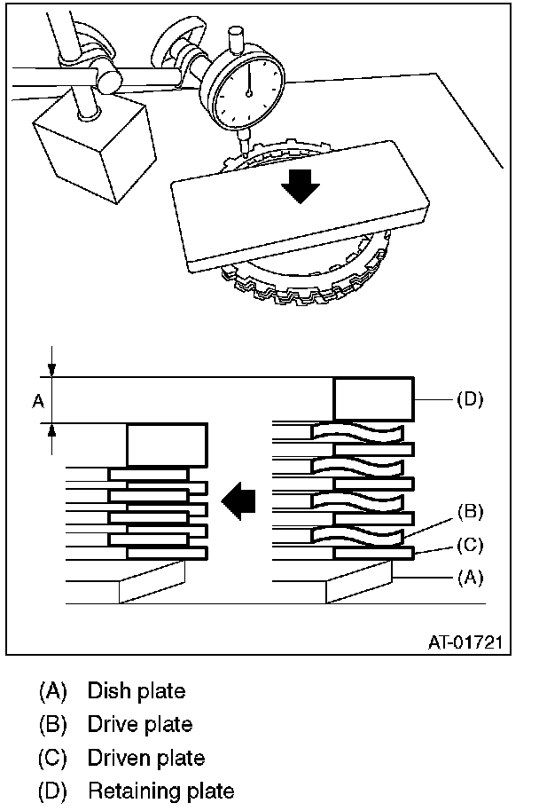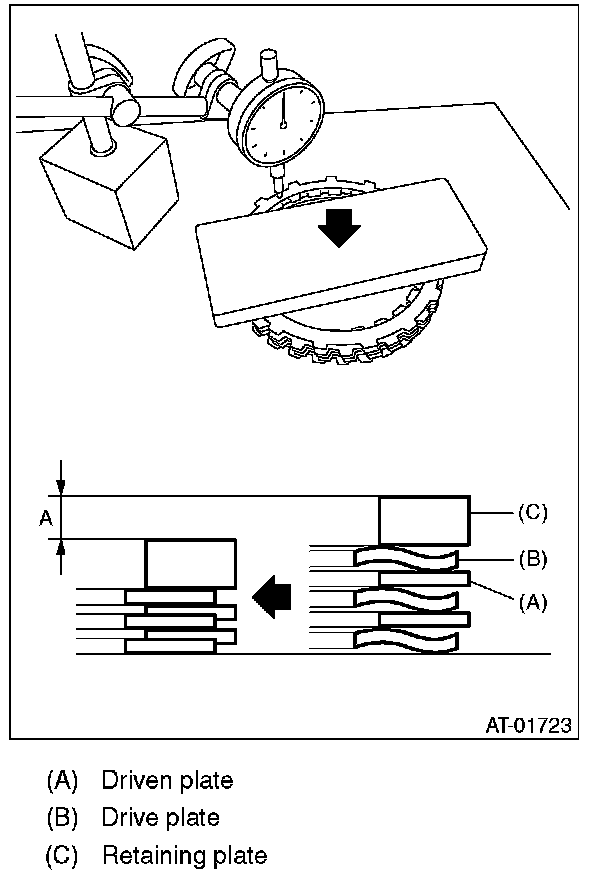13) Press the center of retaining plate with a force of N using a push/pull gauge, and measure and record the drive plate compression amount "A". Measure at three or more locations spaced by equal distances and take the average value.