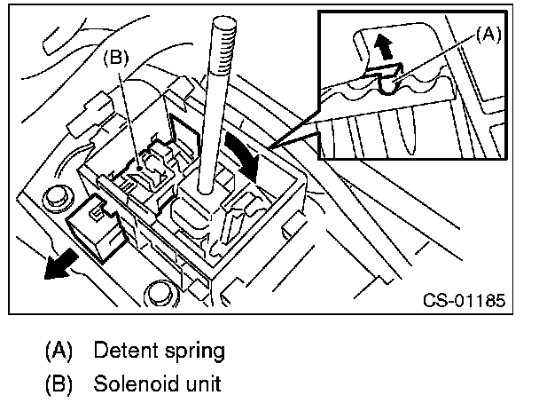 10) With detent spring lifted up, push the select lever backward and remove the solenoid unit.