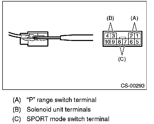 12) Using a flat tip screwdriver with a thin tip, disconnect the terminals of "P" range switch and solenoid unit from the connector.