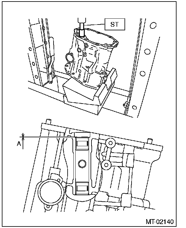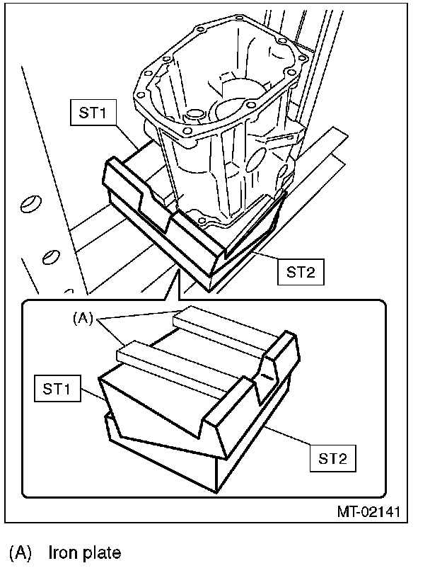 - Insert the iron plate which is thicker than the exposed length of the transfer case knock pin between the ST and transfer case.