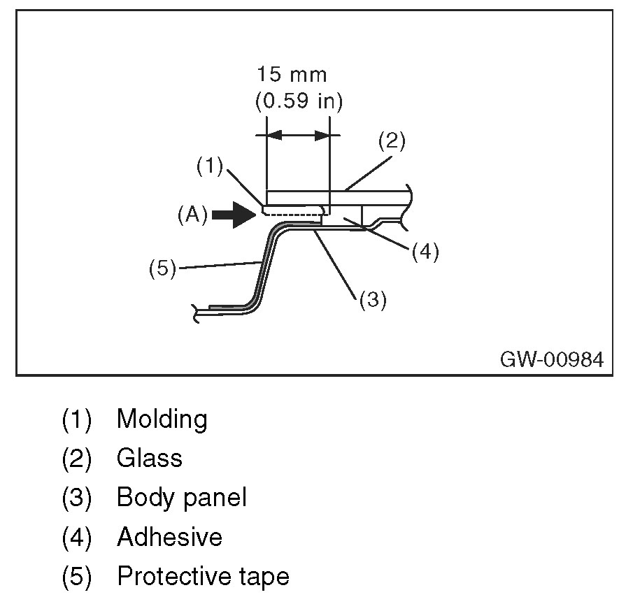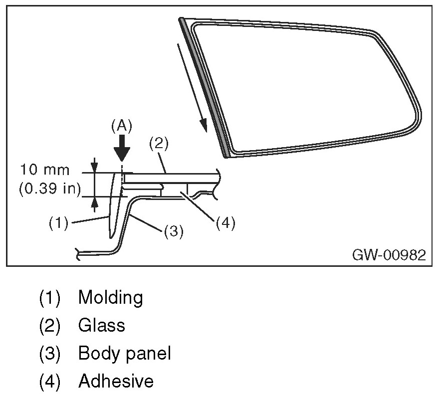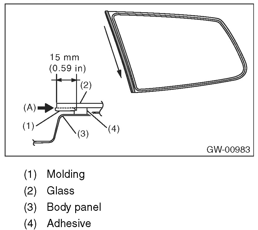 7. Make a slit approximately for 15 mm (0.59 in) to the adhesive surface between molding and glass (arrow position (A)) using a cutter.