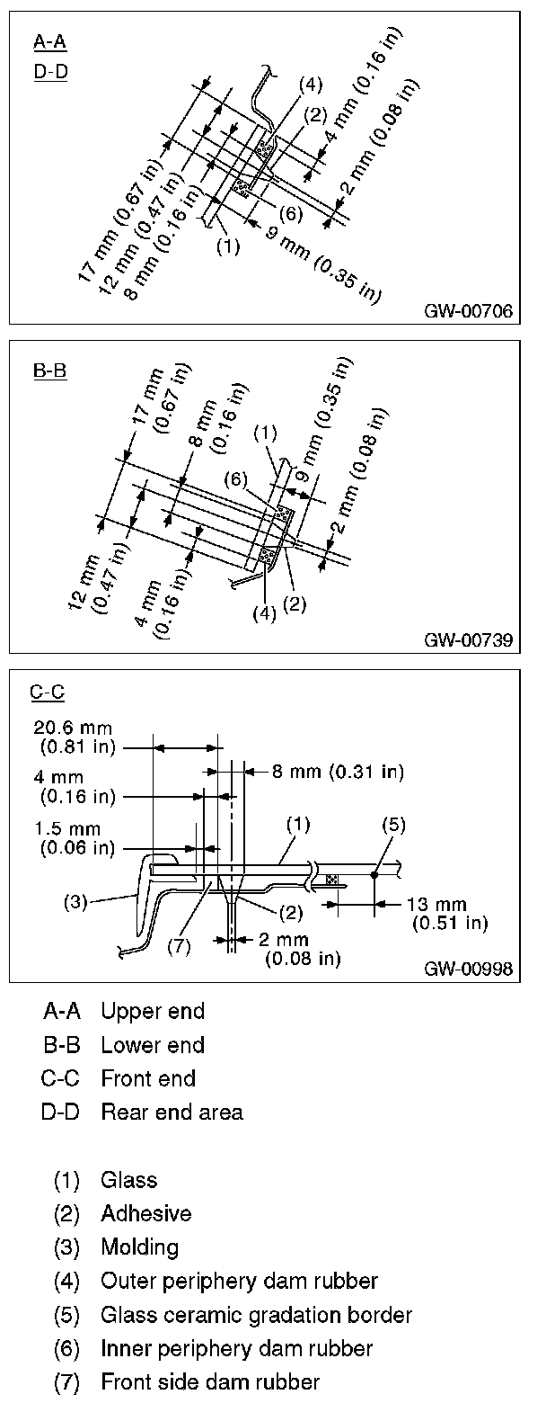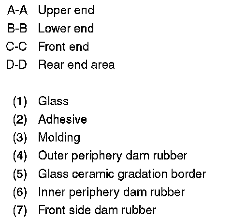 5. On the front end, attach the inner periphery dam rubber at a position 13 mm (0.51 in) from the border of the glass ceramic gradation, and for other locations 17 mm (0.61 in) from the end of the glass.