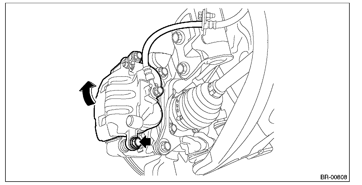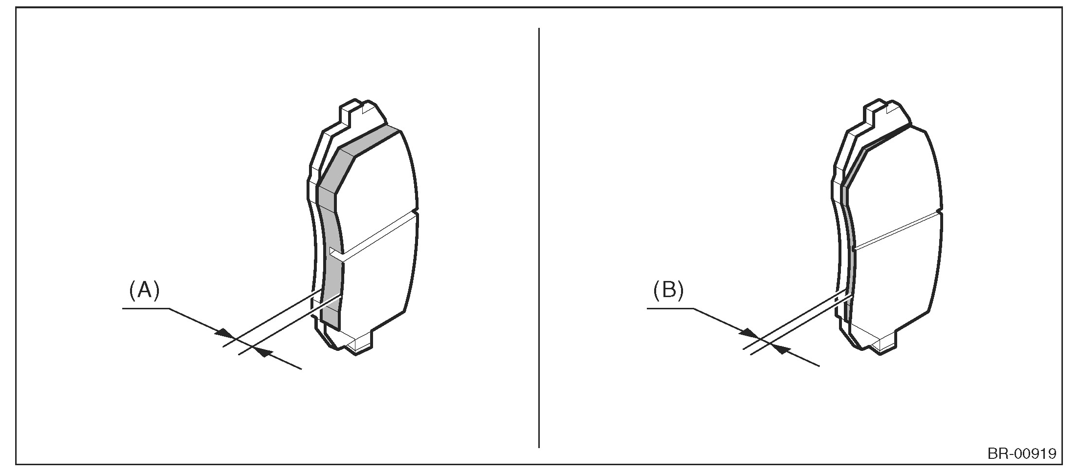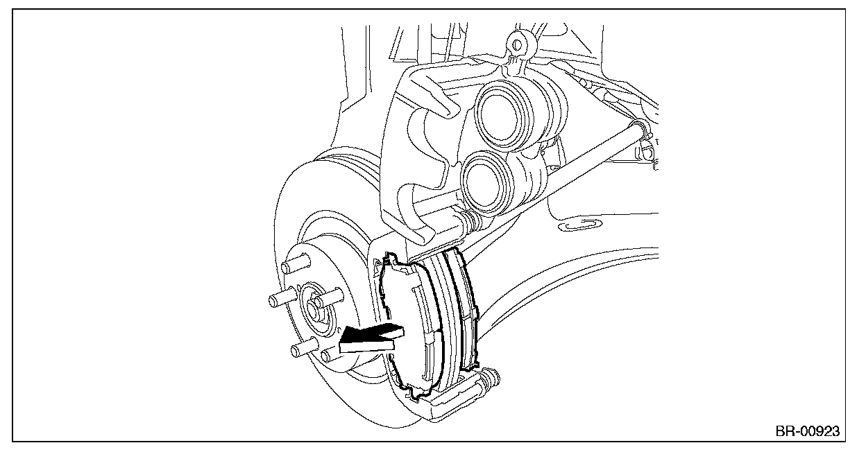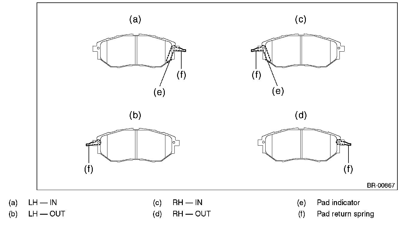 - Wear indicators are installed on the pad - disc brake front inner and the pad - disc brake front outer. If the pad is worn to the limit, the end of wear indicator contacts disc rotor, and a squeaking sound is heard as the wheel rotates. If the sound is heard, replace the pad.