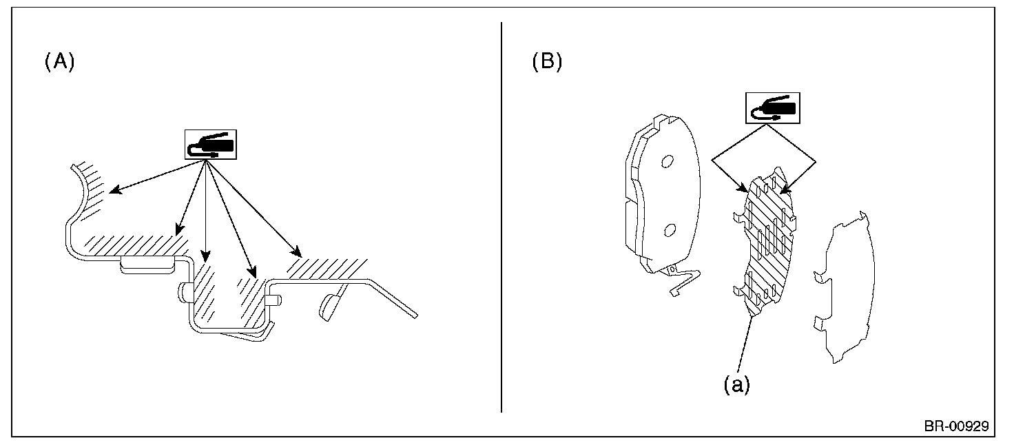 3) Apply a thin coat of grease to the pad and both sides of the shim - disc brake front inner (a). (B)