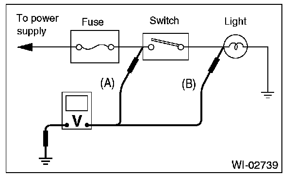 2. Contact the positive lead of the voltmeter on connector (A). The voltmeter will indicate a voltage.
