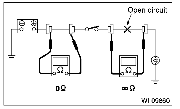 Disconnect all connectors affected, and check continuity in the wiring between adjacent connectors. When the ohmmeter indicates "infinite", the wiring is open.