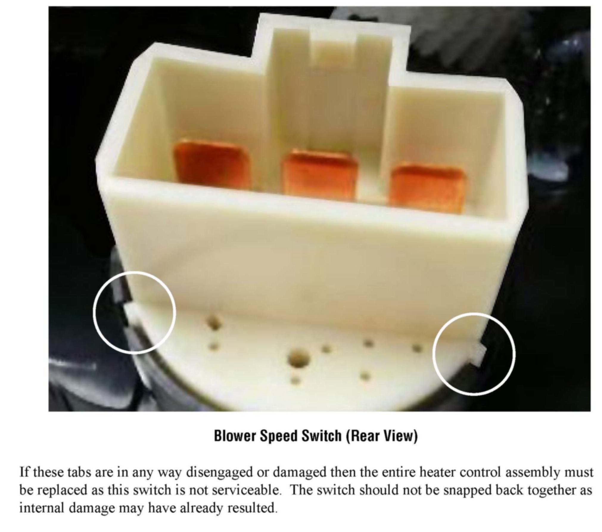 If these tabs are in any way disengaged or damaged then the entire heater control assembly must be replaced as this switch is not serviceable. The switch should not be snapped back together as internal damage may have already resulted.