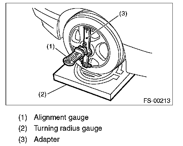 1) Place the front wheel on the turning radius gauge. Make sure the ground contact surfaces of the front and rear wheels are at the same height.