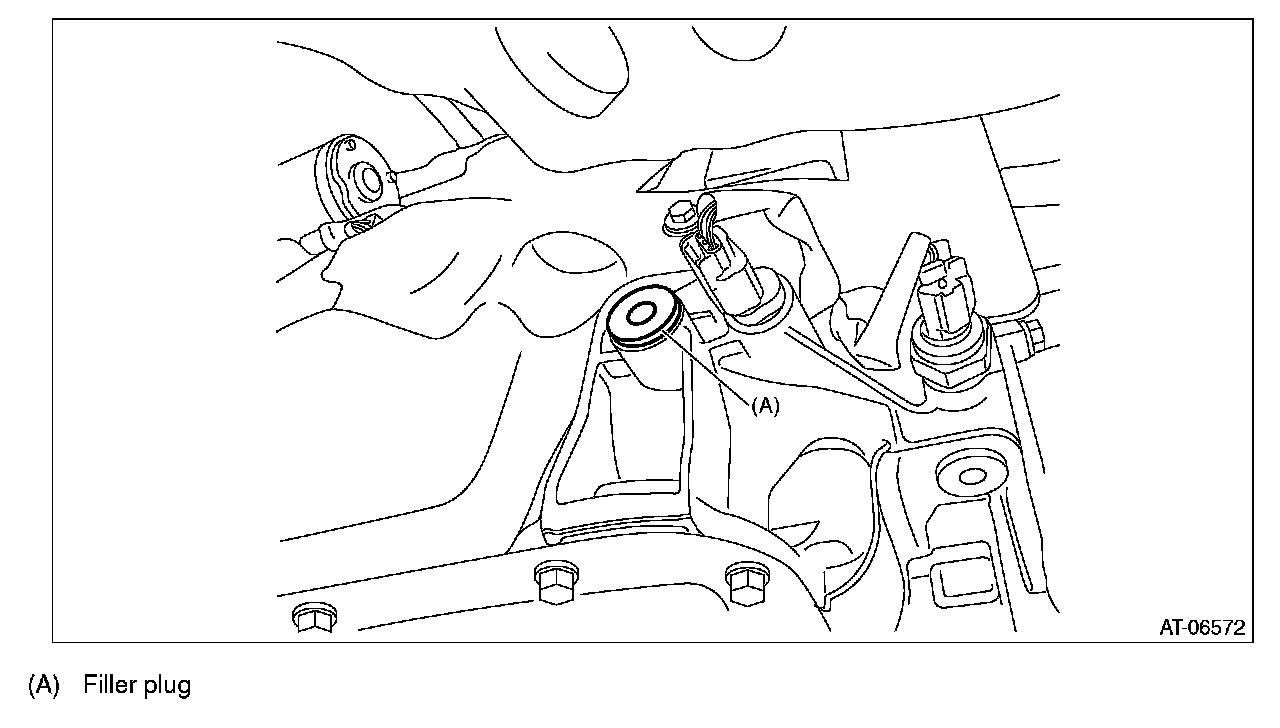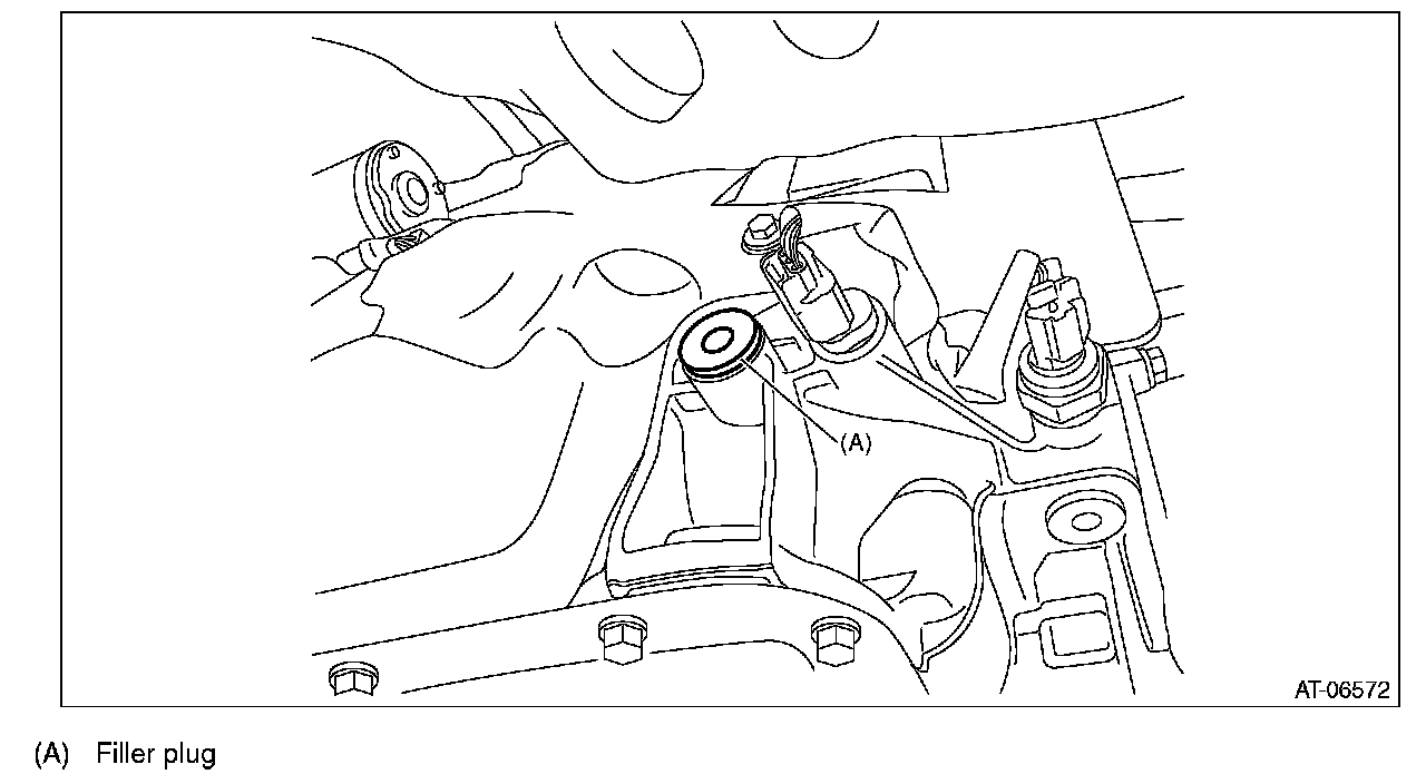 9) With the select lever shifted to "P" range and the engine started, lift up the vehicle. Adjust the CVTF level and check for leakage.