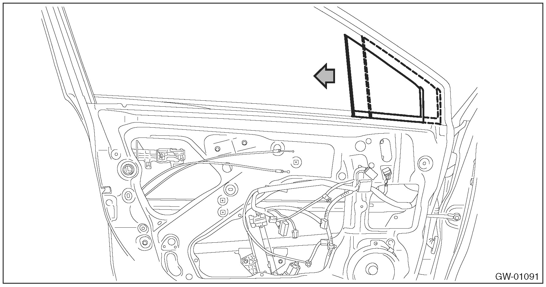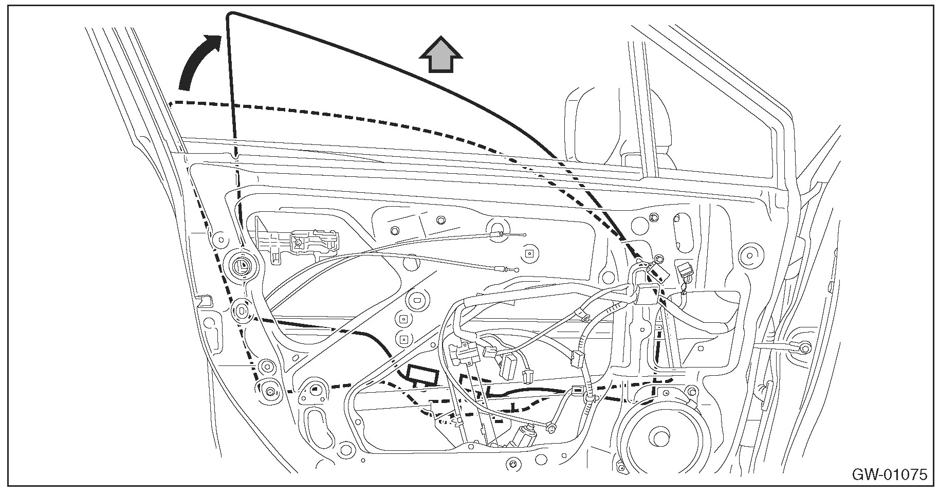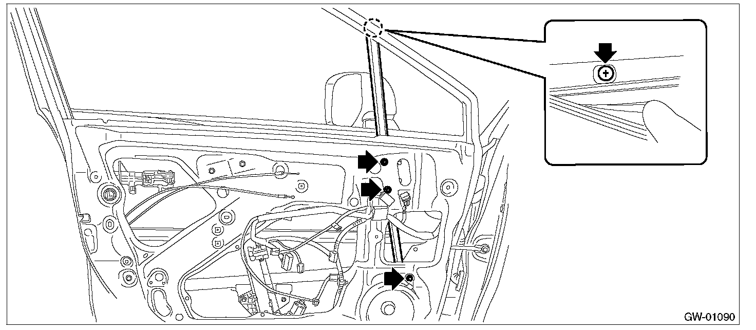1. Operate the switch - power window to move the glass assembly - front door to the position where the mounting bolts can be seen.