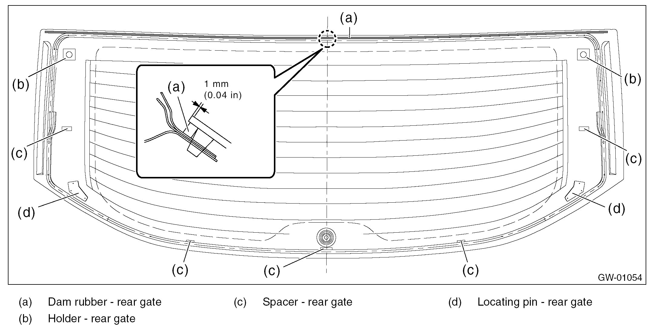 NOTE: Use the markings on the glass to apply adhesive and primer, and to install the dam rubber - rear gate and the spacer - rear gate.