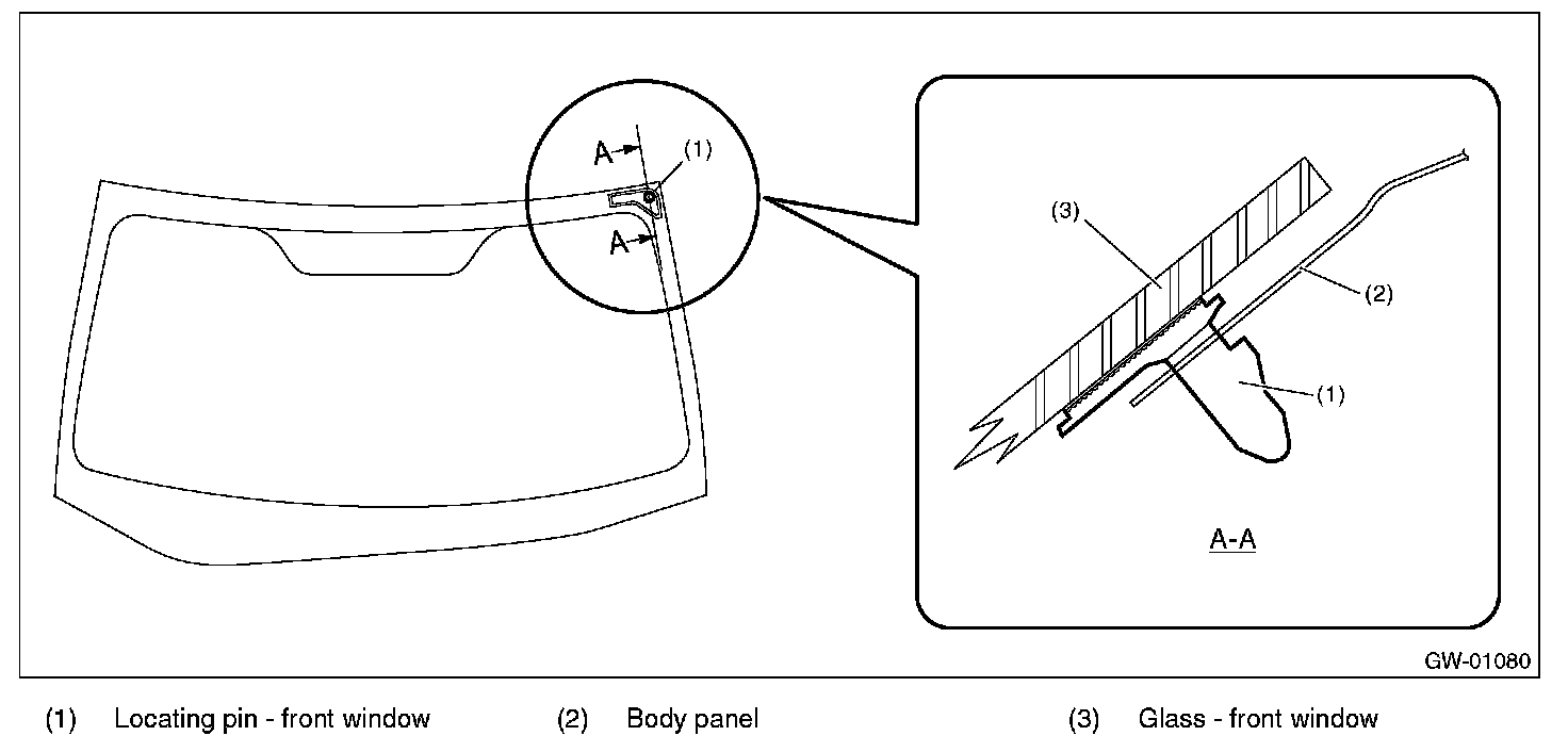 NOTE: The locating pin - front window are bonded to the corners of the glass - front window. Use piano wire to disconnect the pins.