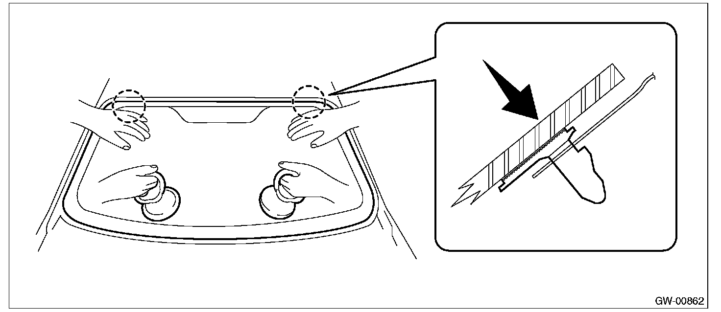 2. Install the molding - front window from both corners of the upper edge toward the center (b).