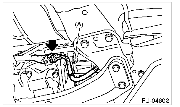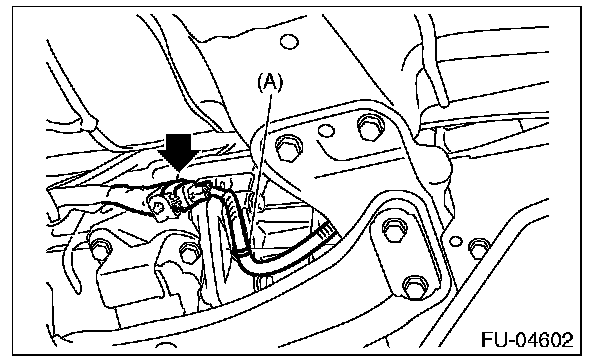 4. Disconnect the connector from the rear oxygen sensor, and remove the clip (A) holding the rear oxygen sensor harness.