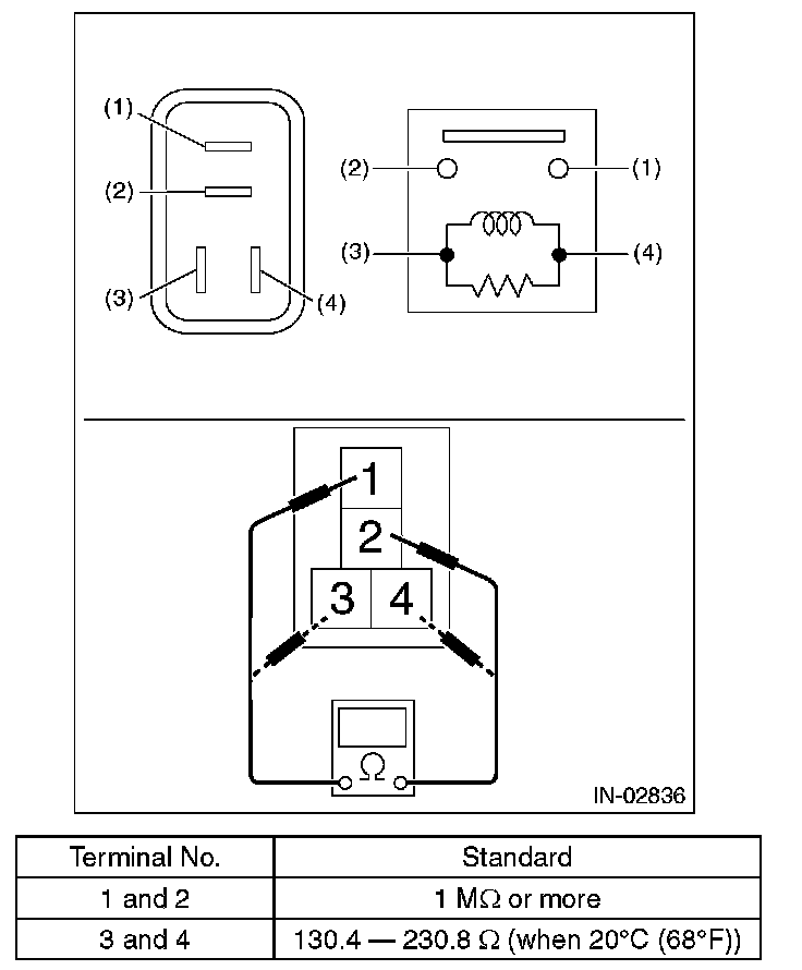 3. Connect battery positive terminal to terminal No. 3 and battery ground terminal to terminal No. 4, and measure the resistance between the main relay terminals.