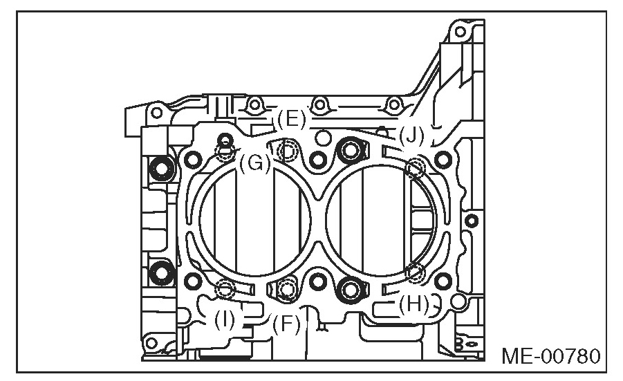10) Tighten the RH side cylinder block connecting bolts (E - J) further in alphabetical order.