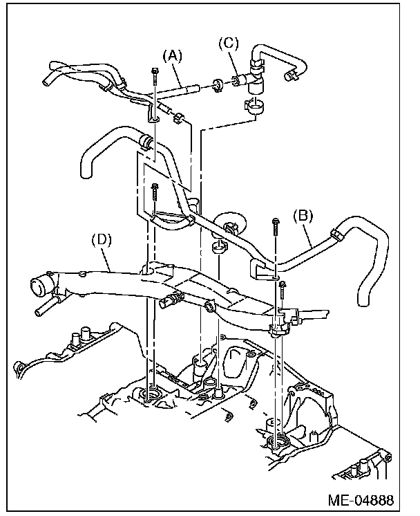 23) Remove blow-by pipe assembly (A), blow-by pipe (B), PCV hose assembly (C) and water pipe assembly (D).