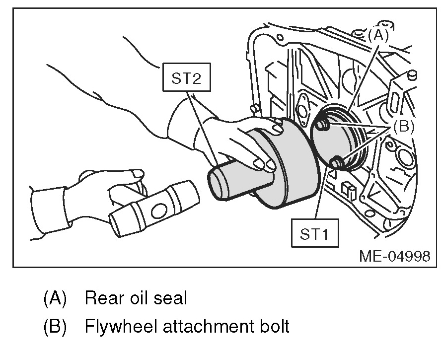 12) Apply a coat of engine oil to the oil seal inner periphery and outer periphery, and install the rear oil seal using ST1 and ST2.