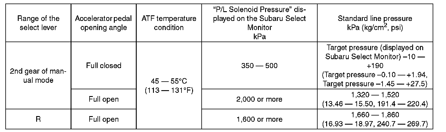 ^ After performing the line pressure test, be sure to cool down the engine for at least one minute with the select lever set in "P" or "N" range and with the idle speed at 1,200 rpm or less.