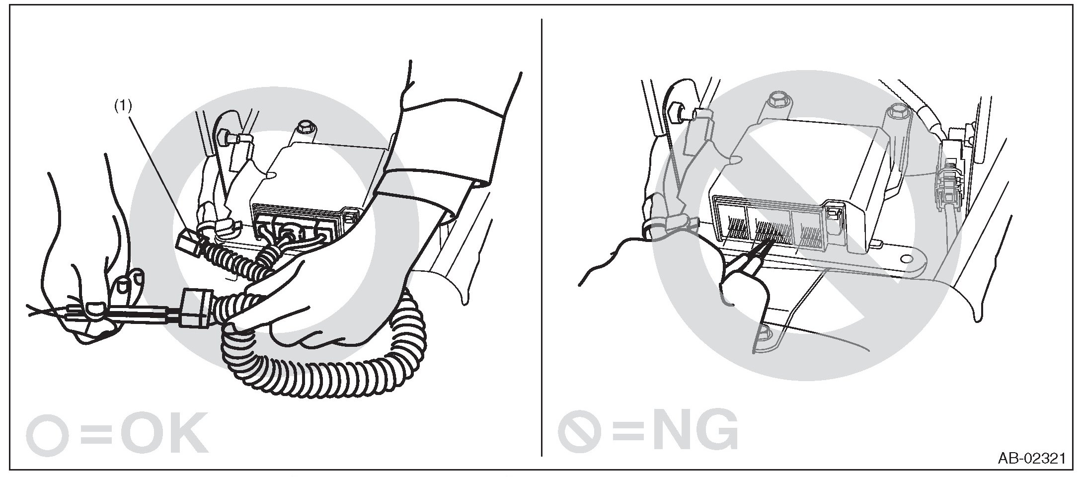 - When checking, use a test harness (1). Damage to connector terminal cause malfunction. Do not directly apply the tester probe to connector terminal of airbag.