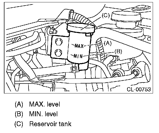 2) Check the clutch fluid level using the scale on the outside of the reservoir tank. If the clutch fluid level is below "MIN", fill the clutch fluid up to "MAX" level, and make sure that there is no leakage.